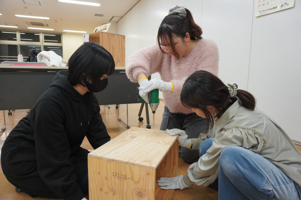 参加者は高校生や大学生、若手社会人など初めてインパクトドライバーを使う人ばかりで、苦戦しながらも協力して本棚を一箱づつ組み立てました。