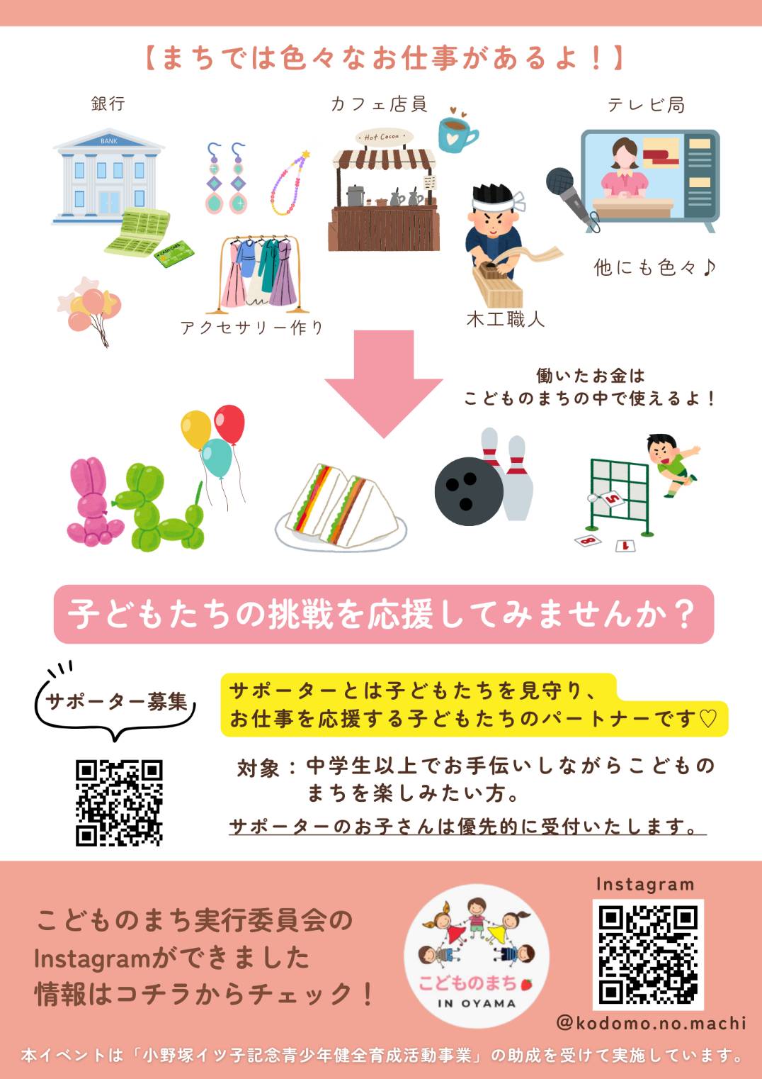 ◆サポーター募集 子どもたちを見守り、お仕事を応援する子どもたちのパートナーです。こどものまちは、子どもたちだけでなく、地域の大人や学生さんの協力によって支えられています。ぜひサポーターとして参加し、子どもたちがつくる”こどものまち”を一緒に見守りましょう! 対象:中学生以上でお手伝いをしながらこどものまちを楽しみたい方。 ※サポーターのお子さんは優先的に受付いたします。