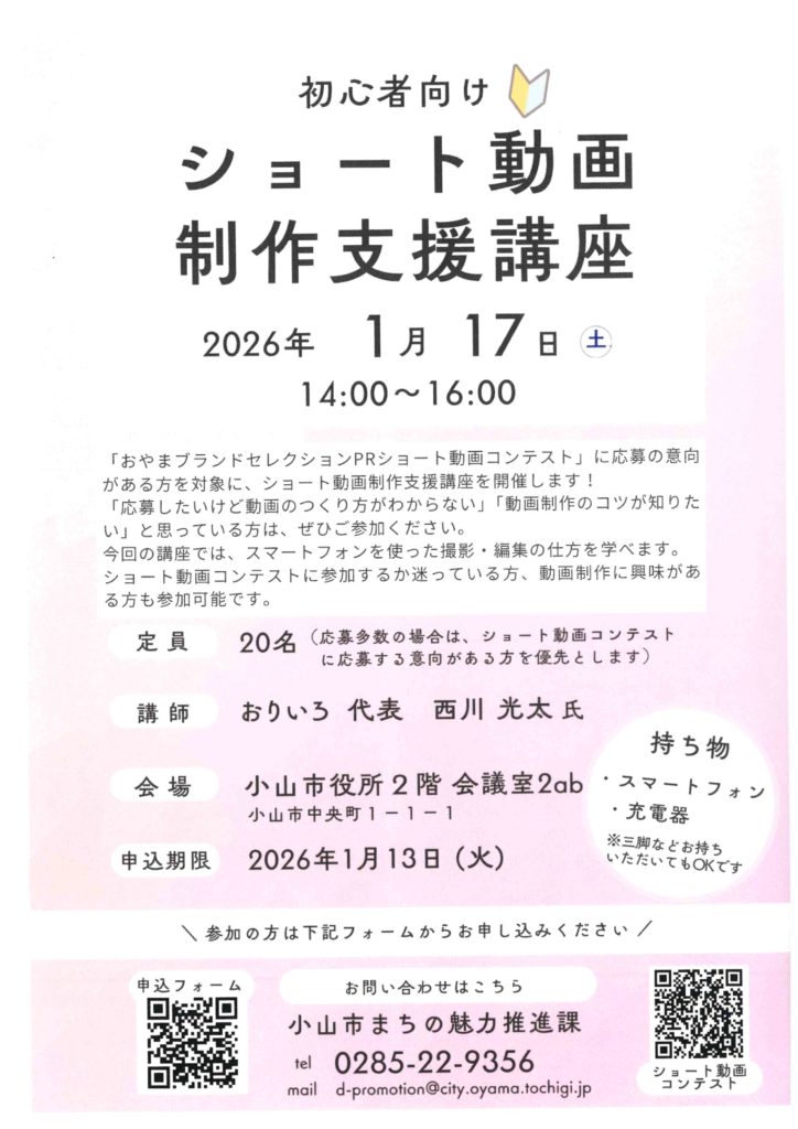 「おやまブランドセレクションPRショート動画コンテスト」に応募の意向がある方を対象に、ショート動画制作支援講座を開催します!