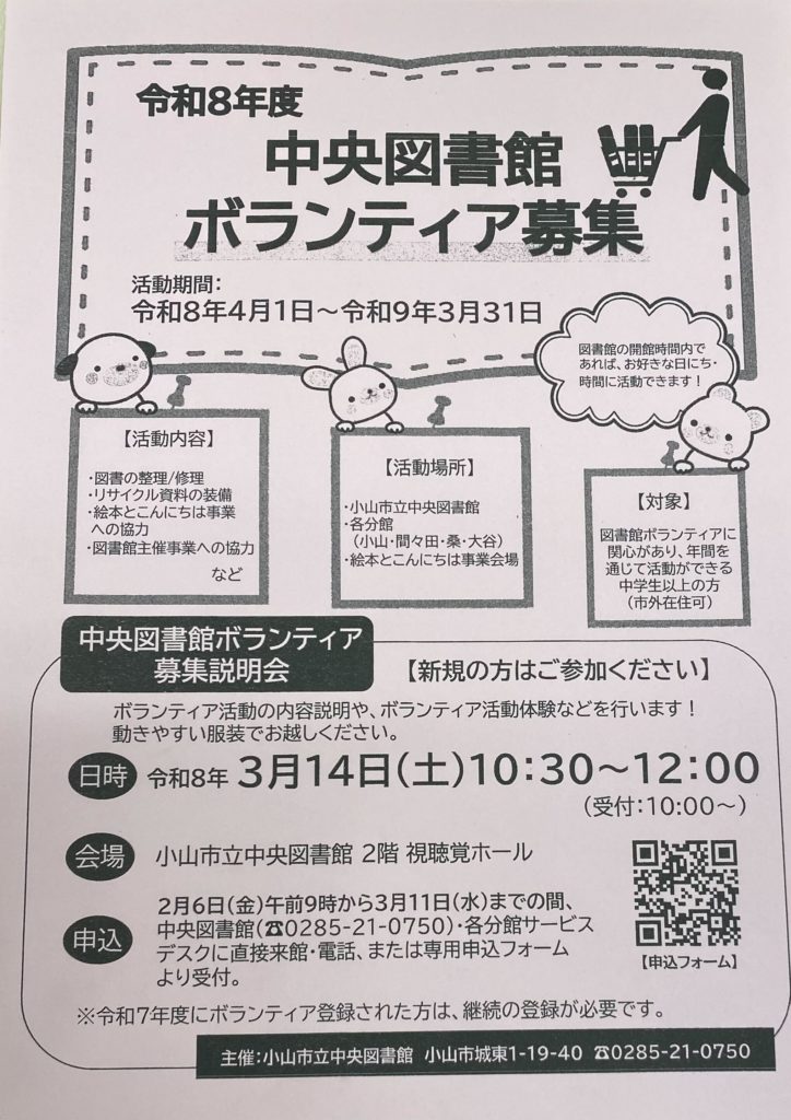 ボランティアの概要は、令和8年4月1日~令和9年3月31日を活動期間とし、活動内容は図書の整理や修理、リサイクル資料の装備、絵本とこんにちは事業への協力、図書館主催事業への協力などです。