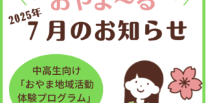 センターからの情報 【7/24(木)】中高生向け「おやま地域活動体験プログラム2025~夏休みにチャレンジの一歩を踏み出そう!~」説明会開催! 中高生が夏休み中に地域の活動に体験するプログラムをおやま~る …