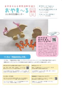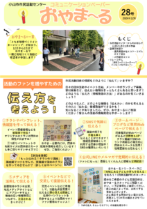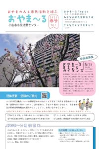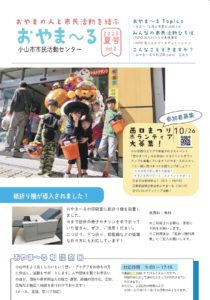 小山市市民活動センターでは、2カ月に一度、コミュニケーションペーパー「おやま~る」を発行しています。 これまで発行した「おやま~る」を閲覧する場合は、画像をクリックして、PDFファイルをダウンロードしてください。 2025年秋号_vol.3 2025年夏号_Vol.2 2025年春号_Vol.1 29号_2025年2月 28号_2024年12月 27号_2024年10月 26号_2024年8月 25号_2024年6月 24号_2024年4月 23号_2024年2月 22号_2023年12月 21号_2023年10月 20号_2023年8月 19号_2023年6月 18号_2023年4月 17号_2023年2月 16号_2022年12月 15号_2022年10月 14号_2022年8月 13号_2022年6月 12号_2022年4月 11号_2022年2月 10号_2021年12月 9号_2021年10月 8号_2021年8月 7号_2021年6月 6号_2021年4月 5号_2021年1月