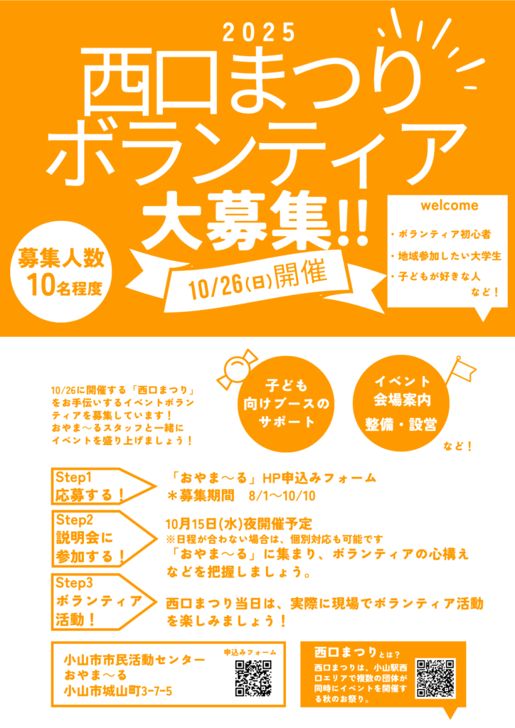 募集:・西口まつりを一緒に盛り上げたいと思っている人・初めてボランティアをする人、地域参加したい学生も大歓迎!