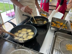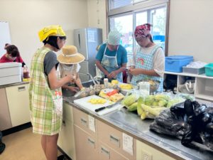 調理ボランティアの人に教えてもらいながら、みんなで手分けをして夏野菜を使った料理を作りました!