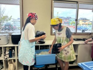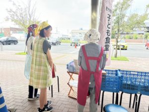 ナス、トマト、キュウリ、ピーマンなど夏野菜たっぷりのお弁当をボランティアの皆さんと一緒に手分けして作りました。中高生のメンバーは、料理に慣れている人もそうでない人も真剣に野菜の下処理に挑戦しました。そして、忙しい中でも調理の終わった休憩中には、ベテランのボランティアさんと一緒に和気あいあいとおしゃべりして交流しました。お弁当配布では、取りに来る子どもたちにお弁当や惣菜、お菓子を優しく手渡ししました。