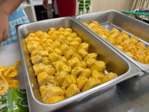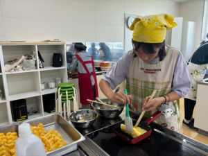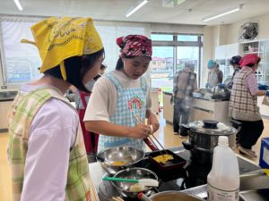 卵をたくさん割って、ボウルで混ぜて、卵焼きにチャレンジしました。調理ボランティアの人に上手く焼くポイントを教えてもらい、ふっくら黄色い卵焼きをいっぱい巻くことができました。できた卵焼きは丁寧に切って並べました。ボランティアの人たちと手分けして調理して、卵焼き、コーン、ゴーヤ、大学芋、那須の炒め物、にんじんサラダなど色とりどりのおかずが並べられました。