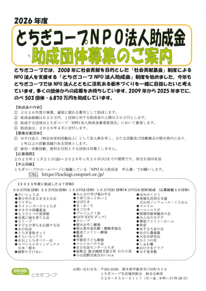 【1月20日(火)〆切】2026年度とちぎコープNPO法人助成金 助成団体募集の2025年11月3日